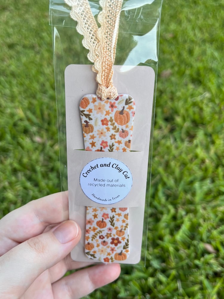 These bookmarks are made out of repurposed clay! I am on a mission to recycle supplies wherever possible. Because they are recycled from past projects where different materials and textures were used, the clay may have some small imperfections in texture or the patterns on the back. Despite this they are still super cute, and good for the environment since these materials were repurposed (yes even the ribbons used! They are from my grandmothers scrap collection)